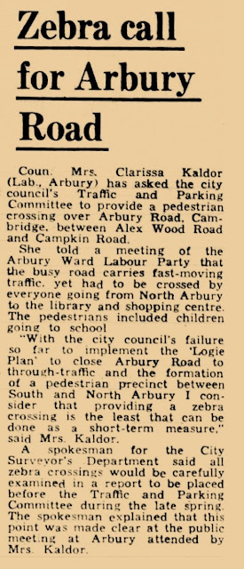 Mrs Clarissa Kaldor, Labour city councillor for Arbury Ward (which then covered the entire historic Arbury area) thought the least the council could do was install a pedestrian crossing on Arbury Road between North and South Arbury. The suggested location was 'between Campkin Road and Alex Wood Road'. Alex Wood Road? Yes, until the building of the large supermarket at Arbury Court (now Budgens), Alex Wood Road terminated at Arbury Road.
